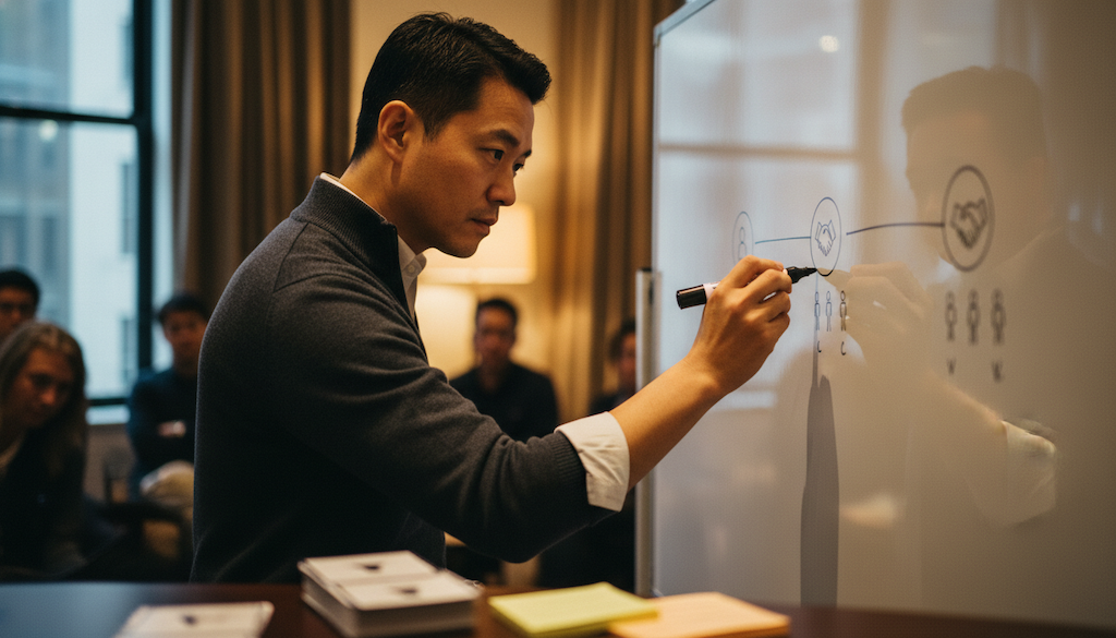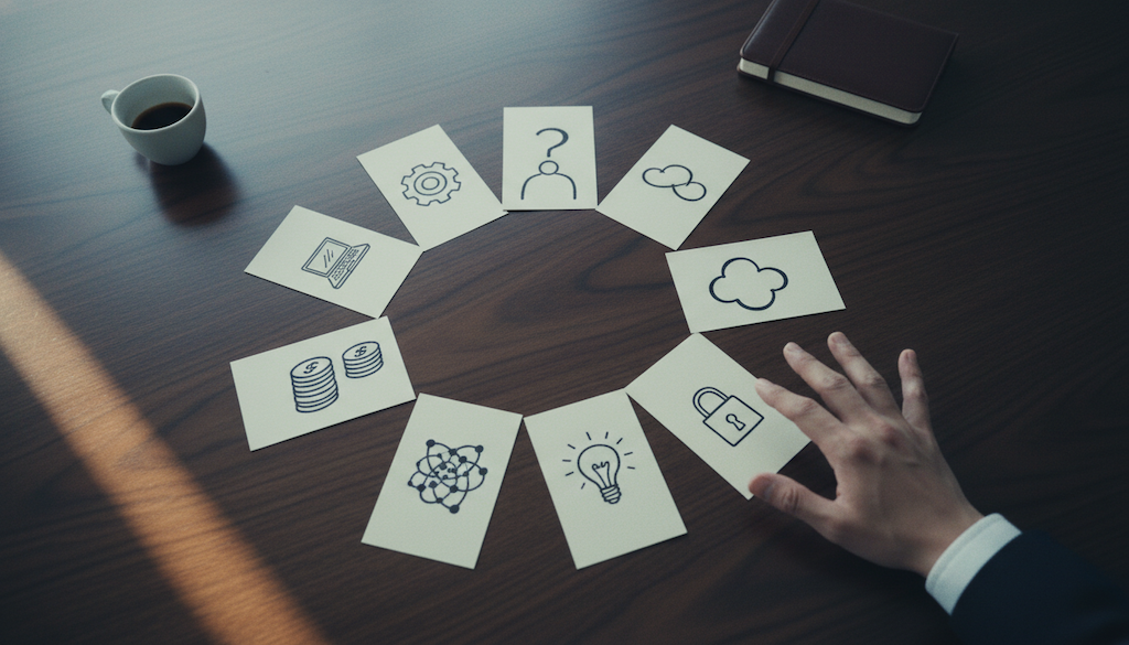 卡牌工作坊的關鍵在把對話從「用嘴講」改成「用手選」。動手挑卡產生「認知所有權」,繞過階級壓力,讓每人有平等發言權。