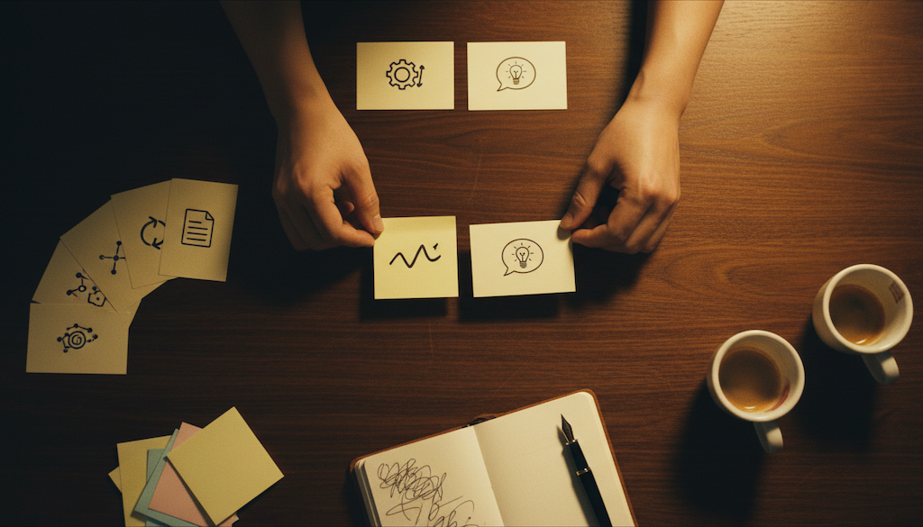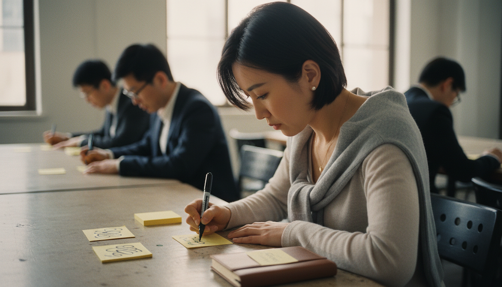 貼上牆後先沉默 3 分鐘,讓所有人讀完每一張。這 3 分鐘會發生一件事:大家發現「原來其他主管也在擔心我以為只有我擔心的事」。這種集體「被看見」的瞬間,是後面共識收斂的第一塊地基。